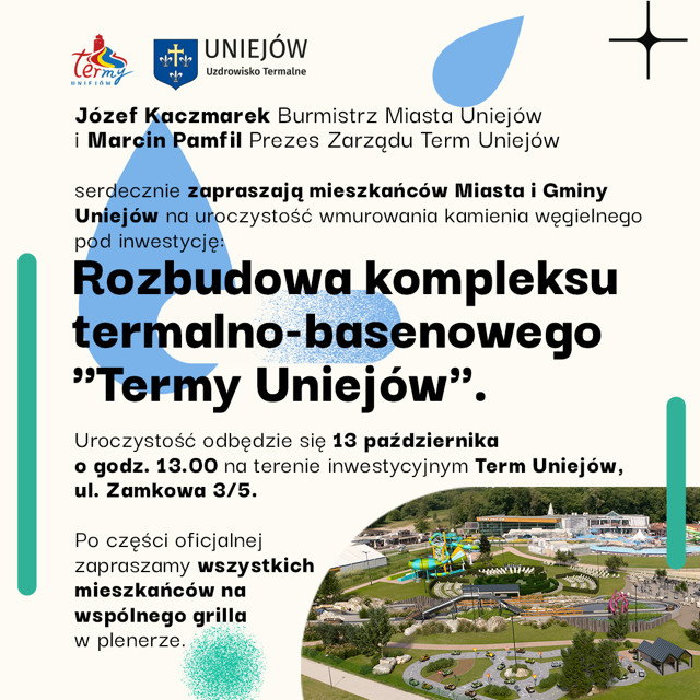 W poniedziałek, 13 października br. odbędzie się uroczyste wmurowanie kamienia węgielnego pod rozbudowę kompleksu basenowego Term Uniejów. Serdecznie zapraszamy wszystkich mieszkańców do wzięcia udziału w wydarzeniu - zaprasza Urząd Miasta w Uniejowie.