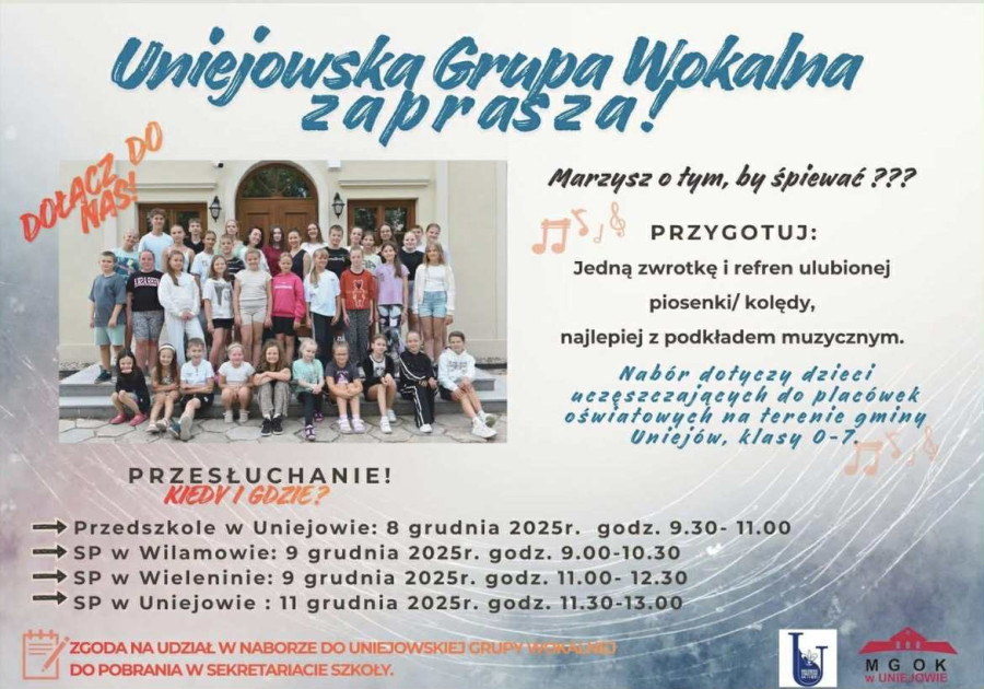 Uniejowska Grupa Wokalna ogłosiła nabór i zaprasza uczniów klas 0-7 z placówek oświatowych z terenu gminy Uniejów do udziału w przesłuchaniach, które odbędą się w dniach 8–11 grudnia 2025 r. w Uniejowie, Wilamowie i Wieleninie. Kandydaci powinni przygotować jedną zwrotkę i refren ulubionej piosenki lub kolędy, najlepiej z podkładem muzycznym.