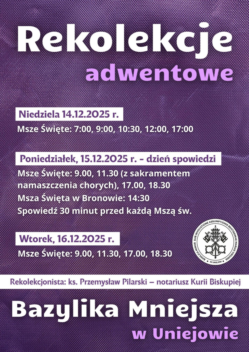 Parafia w Uniejowie serdecznie zaprasza wszystkich wiernych do udziału w rekolekcjach adwentowych, które odbędą się w dniach 14–16 grudnia 2025 roku w Bazylice Mniejszej. Czas ten będzie wyjątkową okazją do duchowego przygotowania się na święta Bożego Narodzenia.