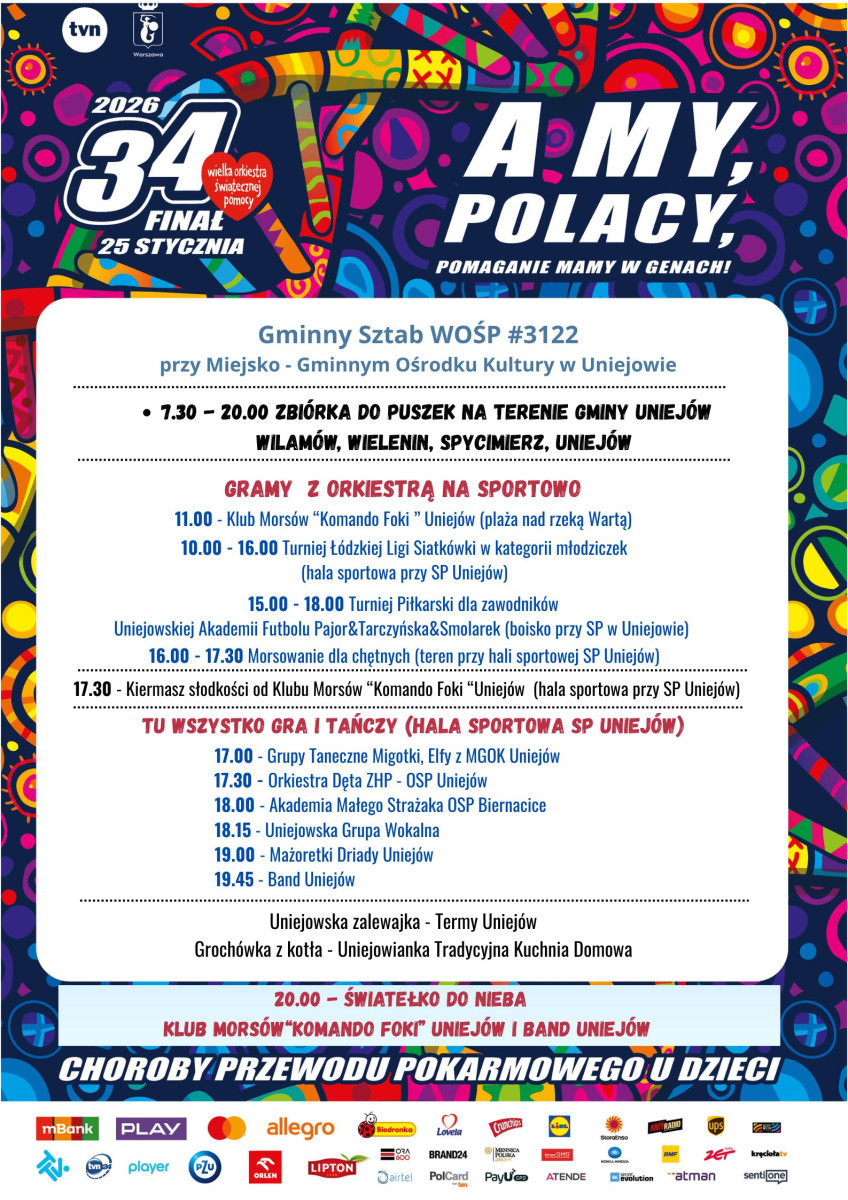 Klub Komando Foki Uniejów serdecznie zaprasza wszystkich na morsowanie podczas 34. finału Wielkiej Orkiestry Świątecznej Pomocy w Uniejowie. Będzie kąpiel w rzece i balia z zimną wodą.