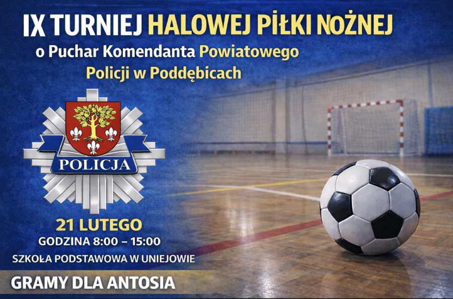 W sobotę 21 marca 2026 roku, od godz. 8:00 na terenie Szkoły Podstawowej w Uniejowie odbędzie się kolejna edycja Turnieju Halowej Piłki Nożnej o Puchar Komendanta Powiatowego Policji w Poddębicach. Środki zebrane podczas wydarzenia zostaną przeznaczone na pokrycie kosztów leczenia 8- letniego Antosia - synka pracownicy poddębickiej komendy, który zmaga się z białaczką - informuje KPP w Poddębicach.