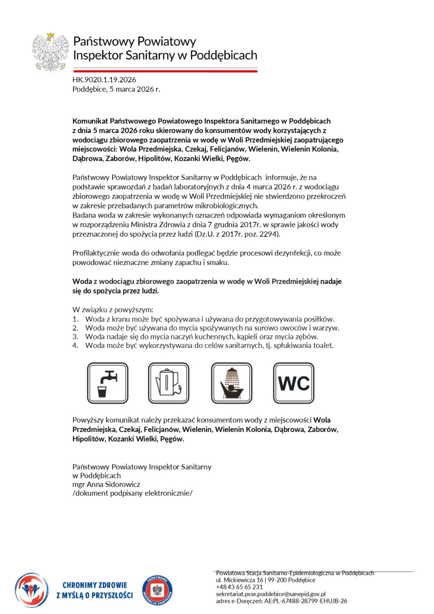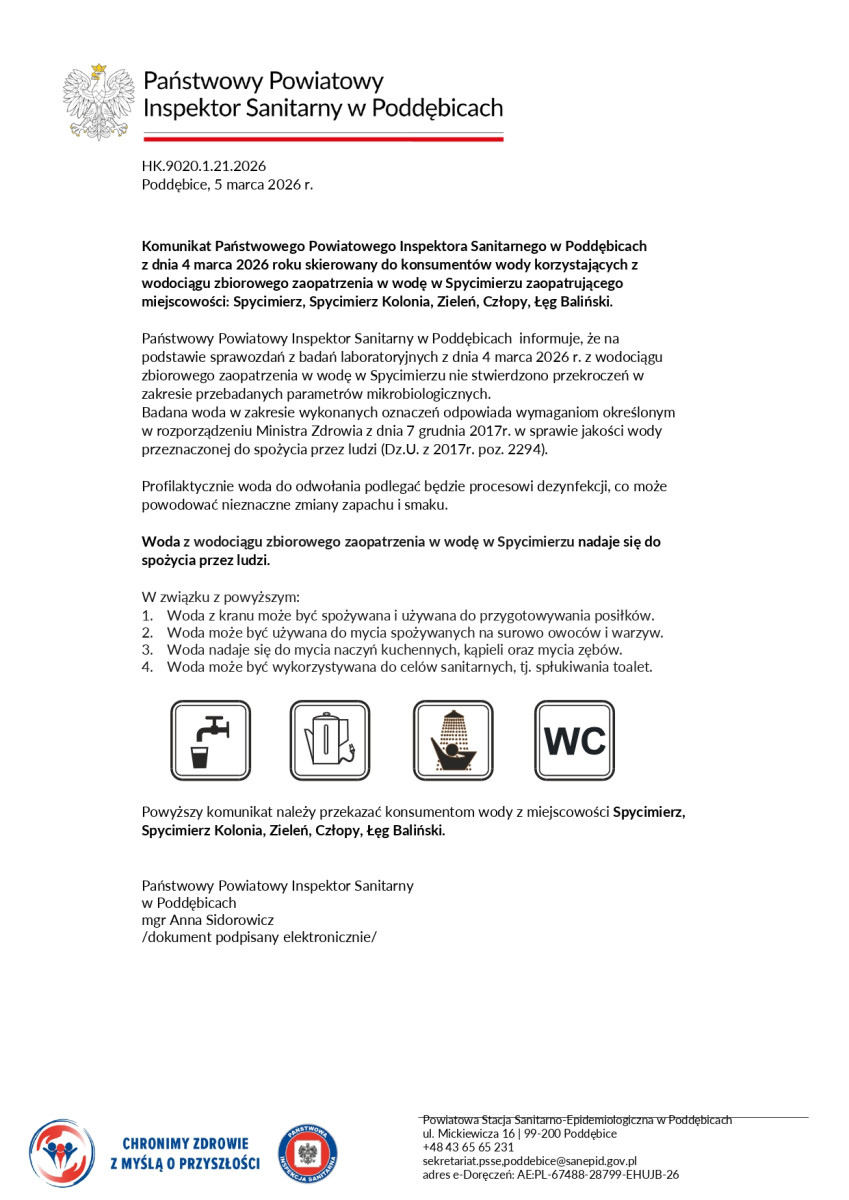 Państwowy Powiatowy Inspektor Sanitarny w Poddębicach w dniu 5 marca 2026 r. opublikował kolejne komunikaty skierowane do: konsumentów wody korzystających z wodociągu zbiorowego zaopatrzenia w Spycimierzu i Woli Przedmiejskiej zaopatrujących miejscowości: Spycimierz, Spycimierz Kolonia, Zieleń, Człopy, Łęg Baliński, Wola Przedmiejska, Czekaj, Felicjanów, Wielenin, Wielenin Kolonia, Dąbrowa, Zaborów, Hipolitów, Kozanki Wielki, Pęgów.