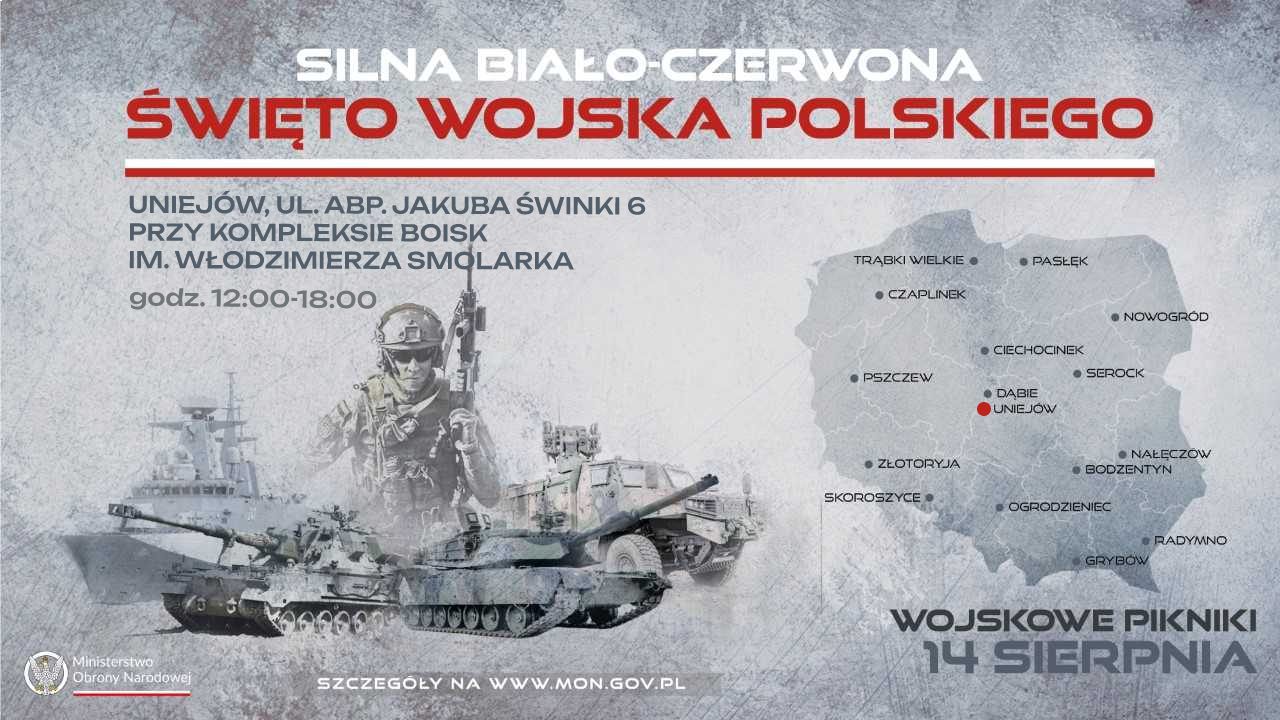Z kolei 14 sierpnia w Uniejowie odbywał się będzie ,,Piknik wojskowy", podczas którego prezentowane będzie indywidualne wyposażenie żołnierzy oraz sprzęt wojskowy będący na wyposażeniu Wojska Polskiego, zorganizowany zostanie mobilny punkt rekrutacyjny oraz strefa zabaw dla dzieci.