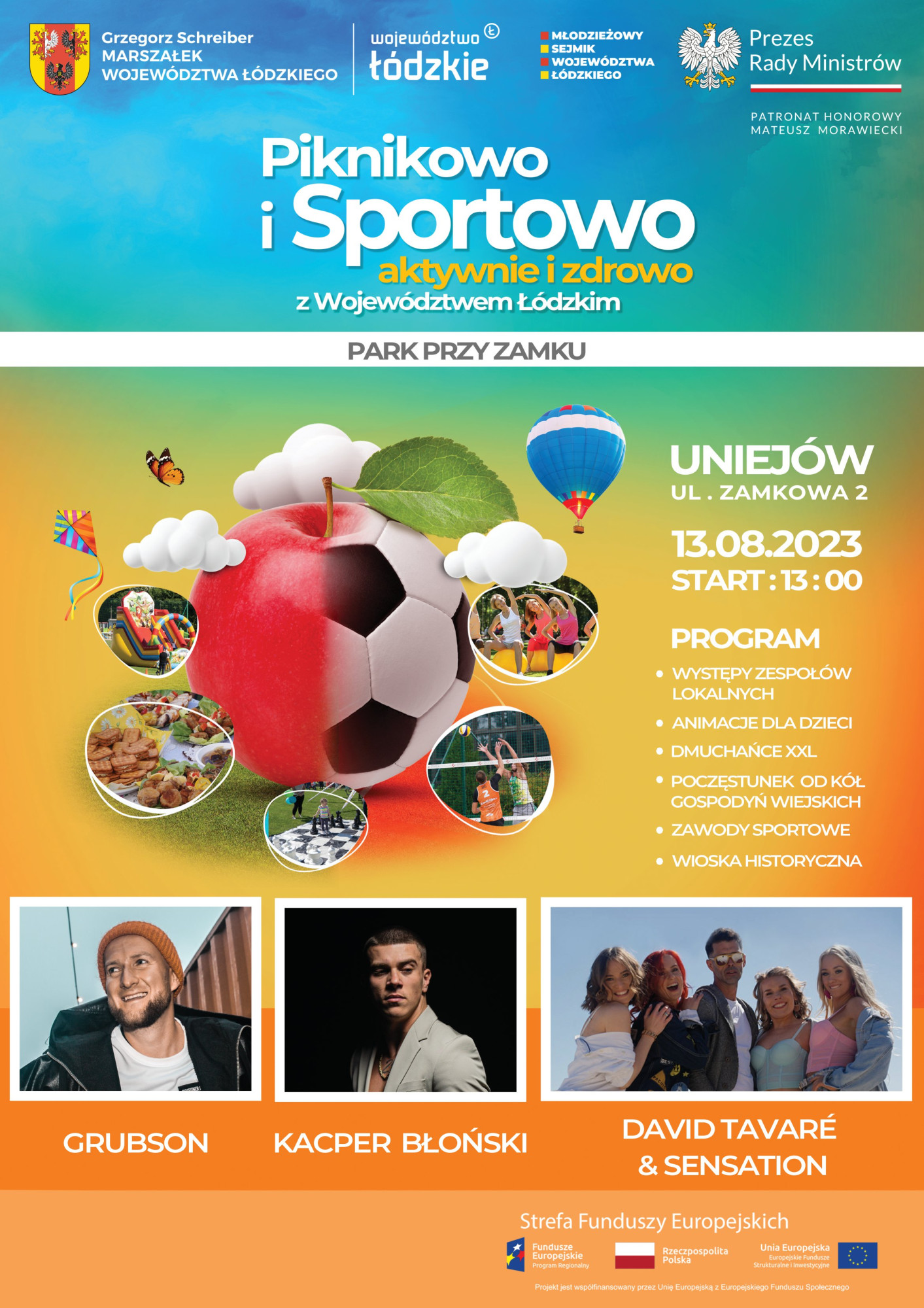 13 sierpnia w Uniejowie odbędzie się impreza z cyklu ,,Piknikowo i Sportowo z Województwem Łódzkim". Jak informują organizatorzy, w ramach pikniku, który rozpocznie się o godzinie 13.00 przy Zamku w Uniejowie zaplanowano atrakcje dla dzieci oraz dorosłych. Na wszystkich czekać będą ponadto bezpłatne atrakcje: gry i zabawy dla dzieci i dorosłych, dmuchańce XXL dla dzieci, stoiska z pysznym jedzeniem i lokalnymi przysmakami od Kół Gospodyń Wiejskich, występy lokalnych artystów. Na scenie pojawią się także znani artyści, zagrają: Grubson, Kacper Błoński oraz David Tavare & Sensation.