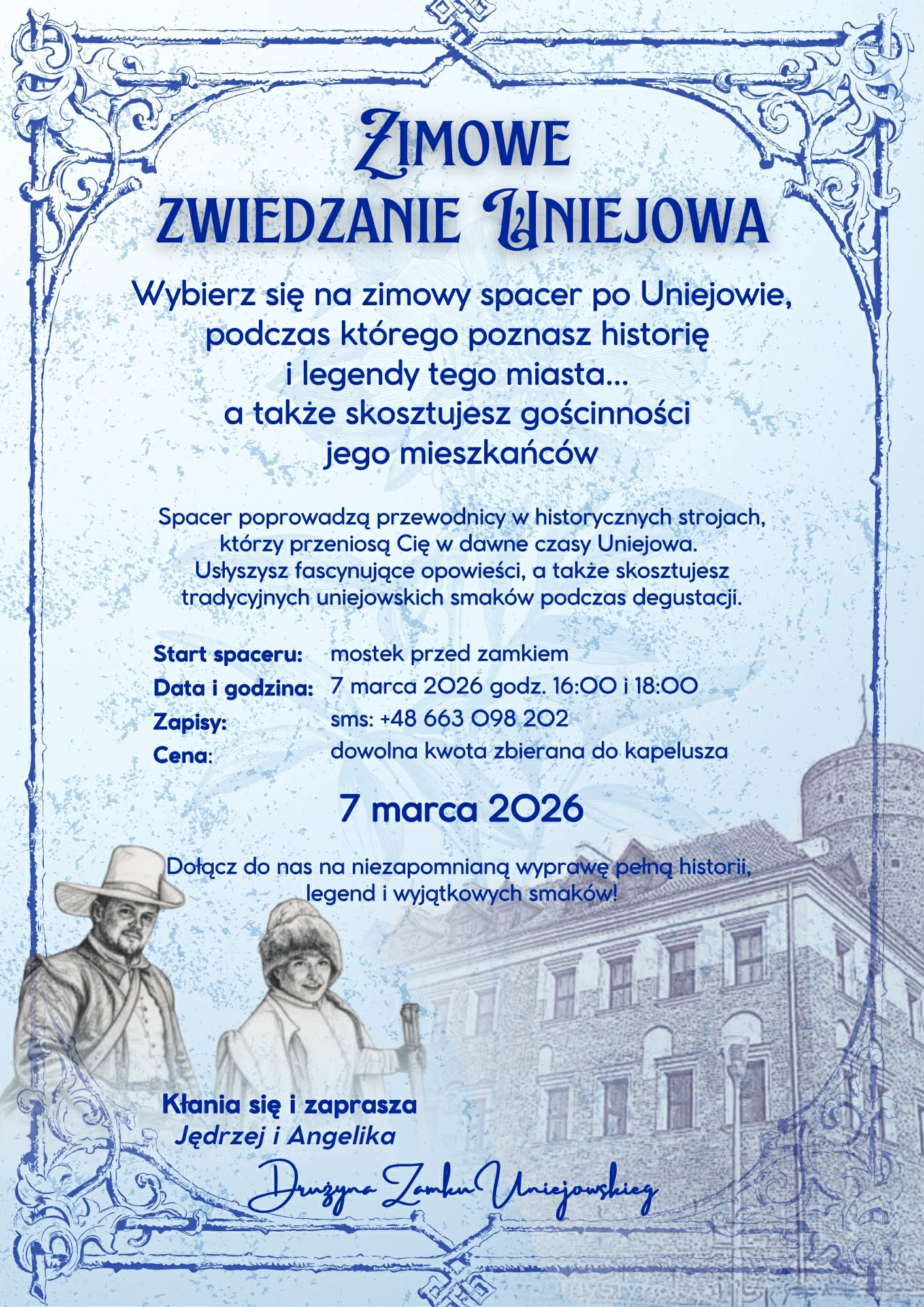 Zimowy spacer to niepowtarzalna okazja, by przenieść się w czasie i spojrzeć na znane zakątki Uniejowa z zupełnie nowej perspektywy. Przewodnicy – Angelika i Jędrzej – wystąpią w strojach historycznych, co nada wydarzeniu wyjątkowego, dawnego klimatu.
