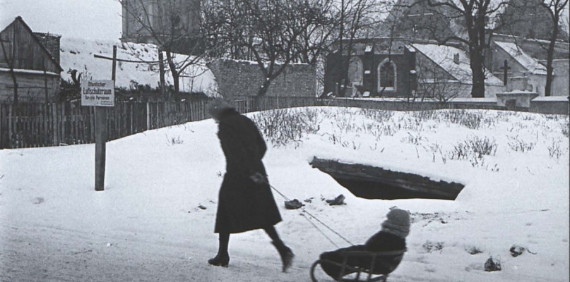 Uniejów 8 lutego 1942 roku. Na pierwszym planie tabliczka informacyjna o schronie przeciwlotniczym dla ludności niemieckiej. W tle widoczna zniszczona kolegiata. Ze zbiorów Arch. Igły, z arch. Bibliotheca Turcoviana