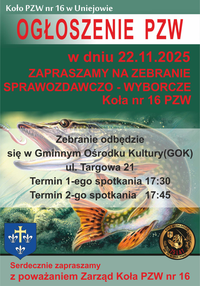 Koło Polskiego Związku Wędkarskiego nr 16 w Uniejowie zaprasza wszystkich członków na zebranie sprawozdawczo-wyborcze, które odbędzie się 22 listopada 2025 roku. Spotkanie zaplanowano w Gminnym Ośrodku Kultury w Uniejowie, przy ul. Targowej 21.