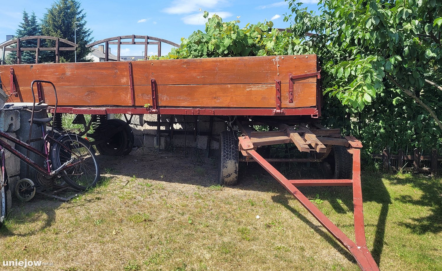 Przyczepa dwuosiowa na ramie metalowej, skrzynia drewniana Wymiary: długość 3,75 m Szerokość: 1.55 m Wysokość 1,40 m